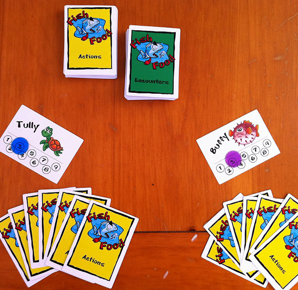 A fun game for the whole family. It's a fish eat fish world out there so watch out. Get ahead by eating smaller fish and growing bigger. Use actions in your hand to modify the sizes to give yourself a temporary defensive boost or to help attack an opposing player. Look out for Event cards like the Shark or Take the Bait which can mix up the game. First player to size 10 wins, but if you get knocked to 0 you lose! Simple math skills are used throughout the game, although there are plenty of chances to use advanced strategy too!
